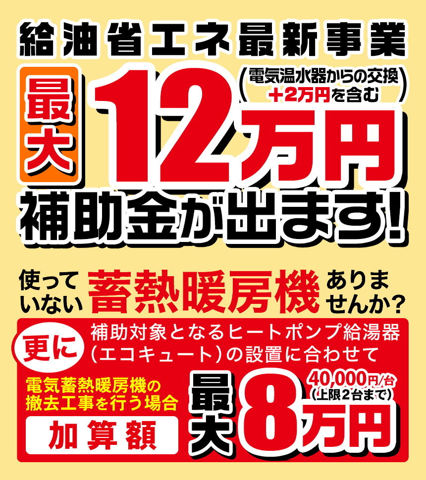 さらに電気温水器を撤去しエコキュートへ交換される場合は、+2万円が加算され、最大12万円の補助が受けられます!